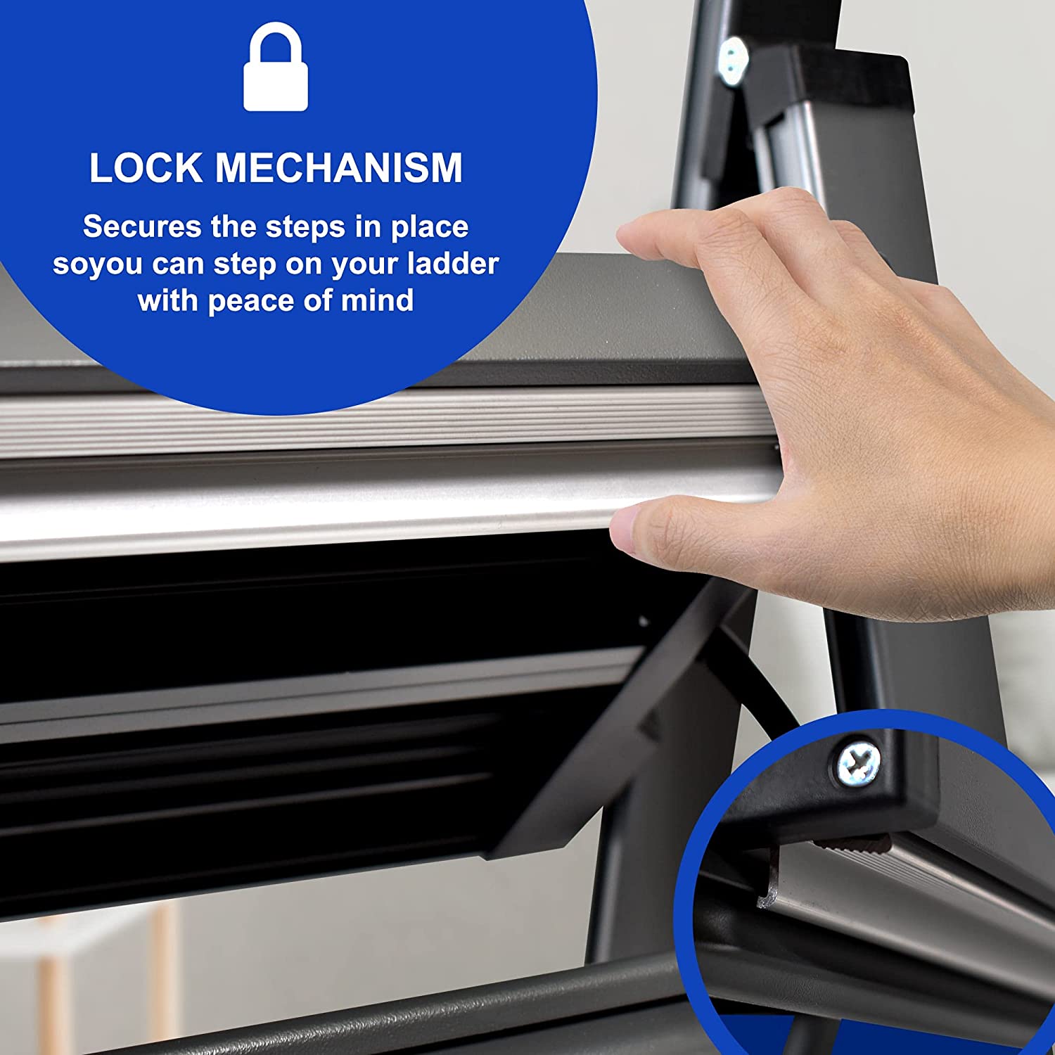 Anti-slip ribbed steps for added security and slipping prevention, the steps are made from high-quality brushed aluminum, providing strength and style. Rubberized feet keep the ladder from slipping and prevents your floor from getting scratched during use. Extra-large, the oversized top platform provides a safe, stable, and comfortable place to stand and eliminates fatigue