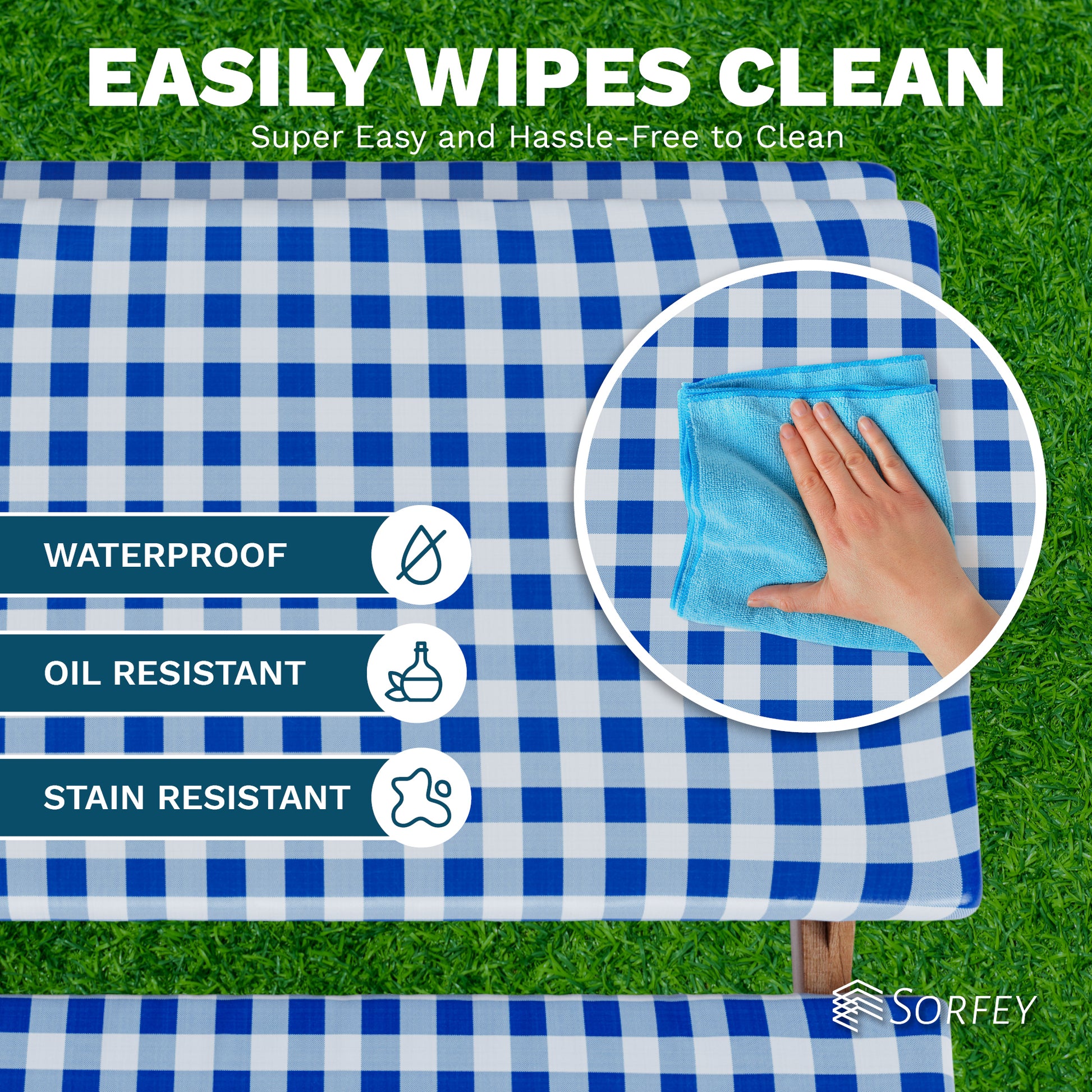 Transform your outdoor dining experience with Sorfey Picnic Table Tablecloths, meticulously designed for a secure fit even in windy weather. This set includes 1 tablecloth and 2 bench covers, ensuring nothing hinders your enjoyment of al fresco dining.